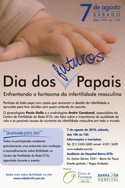No próximo dia 7 agosto acontece o ‘Dia dos Futuros Papais – Enfrentando o fantasma da infertilidade masculina’ encontro comandado pelo ginecologista Paulo Gallo e o andrologista André Cavalcanti, especialistas do Centro de Fertilidade da Rede D’Or, que vão falar sobre a importância da qualidade de vida e as possíveis causas do aumento da infertilidade masculina em todo o mundo.
