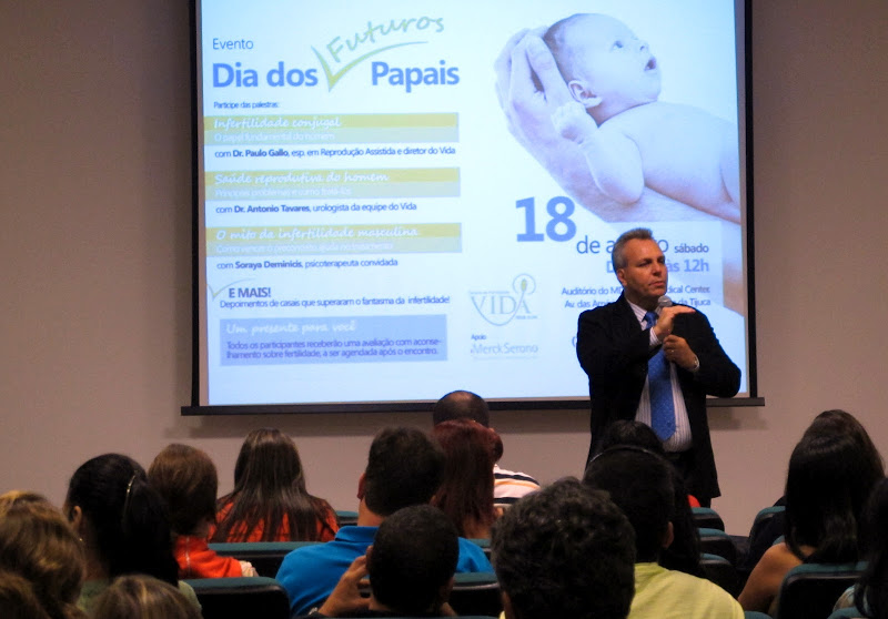 O tradicional evento que o Vida – Centro de Fertilidade da Rede Dor realizou no dia 18 de agosto, em homenagem ao Dia dos (Futuros) Papais, encheu a sede da clínica, na Barra. Mais de 100 moradores da região e de outras partes do estado foram conferir de perto os depoimentos emocionantes de casais que superaram a infertilidade masculina e trocar experiências, além de tirar dúvidas em palestras com especialistas em reprodução humana, urologia e psicoterapia.